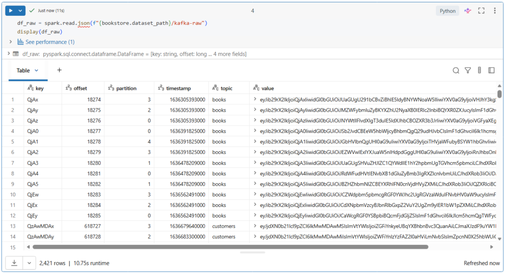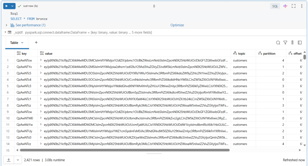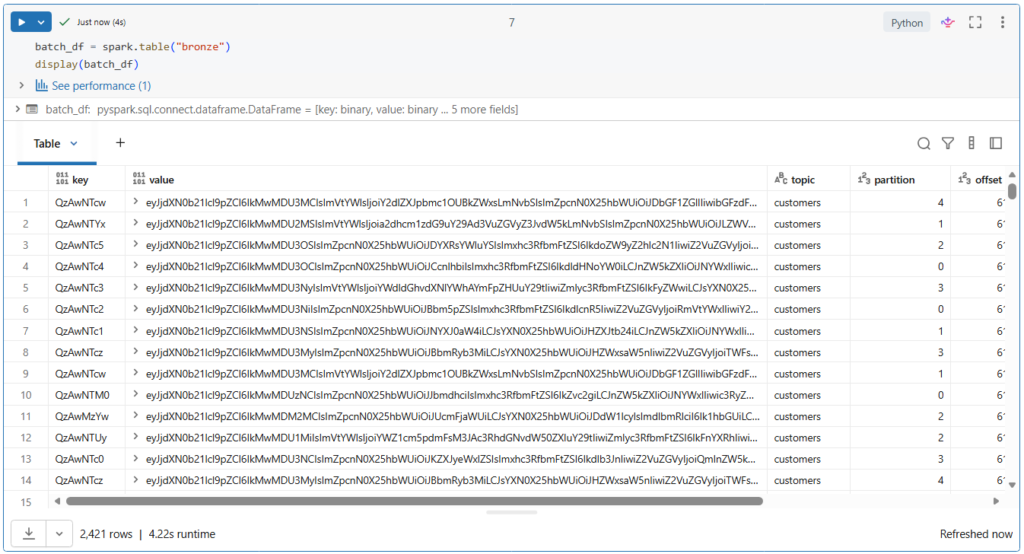 Here we see the full Kafka schema, including the topic, key and value columns that are encoded in binary.