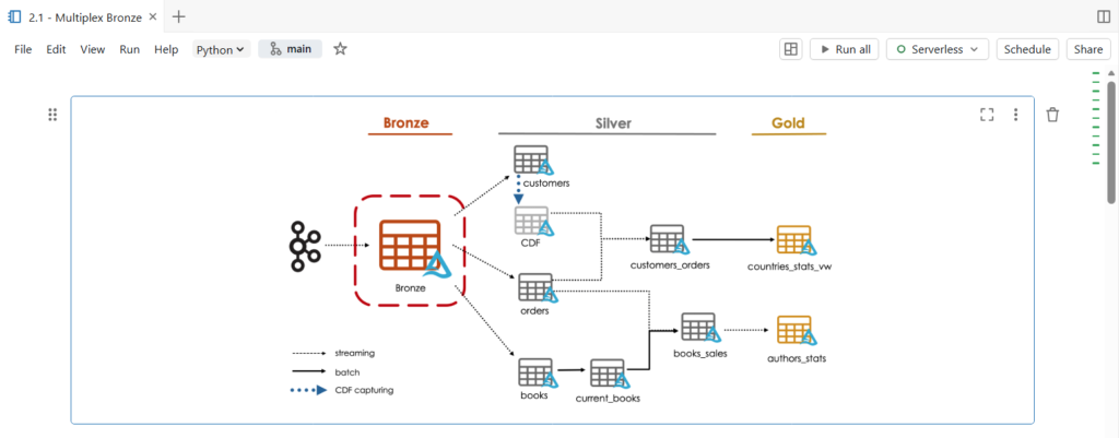 Each data source is ingested into a separate bronze table, so we end up here having three bronze tables, customers, books and orders.