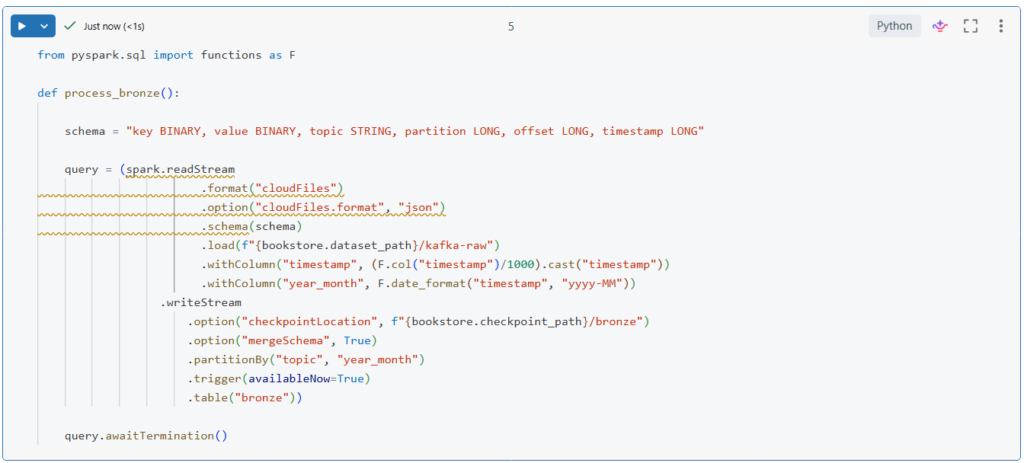 In this function, we start by configuring the stream to use Autoloader by specifying the cloudFiles format.