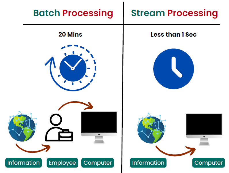 Stream Processing: Real-time data processing, analyzing data as it arrives, suitable for immediate insights and actions.