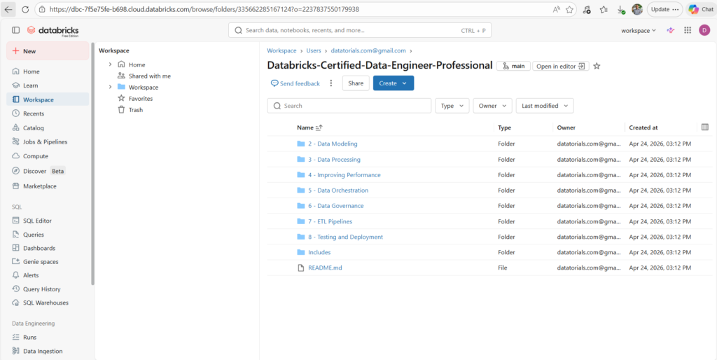 The source code is available here on GitHub (https://github.com/datatorials/Databricks-Certified-Data-Engineer-Professional.git), and we can easily clone this repository in Databricks Workspace using Databricks Git folders.