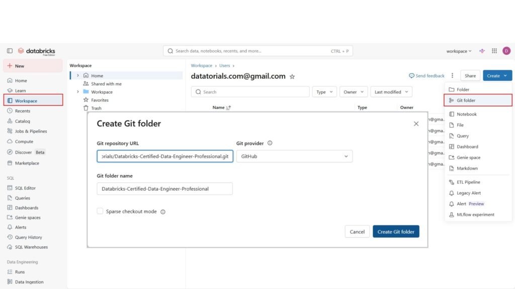 - First to the “Workspace” tab in the left sidebar, and now on the right click the Create button and choose “Git folder“. Git folders are special types of folders that provide source control for your data projects by integrating with Git providers.