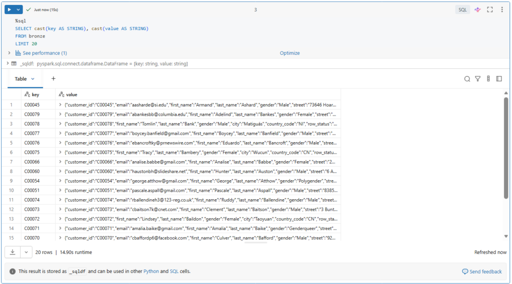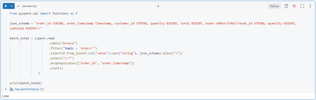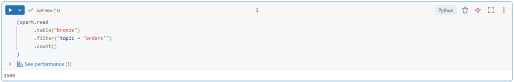 Before starting, let us identify the current number of records in our orders topic of the bronze table.
