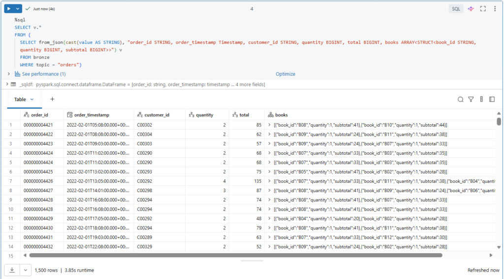 SELECT from_json(cast(value AS STRING), "order_id STRING, order_timestamp Timestamp, customer_id STRING, quantity BIGINT, total BIGINT, books ARRAY<STRUCT<book_id STRING, quantity BIGINT, subtotal BIGINT>>") v