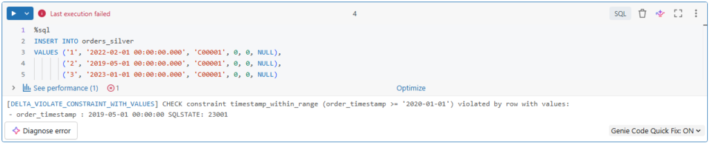 However, as we saw with the above timestamp constraint, if a batch of data contains records that violate the constraint, the job will fail and throw an error.